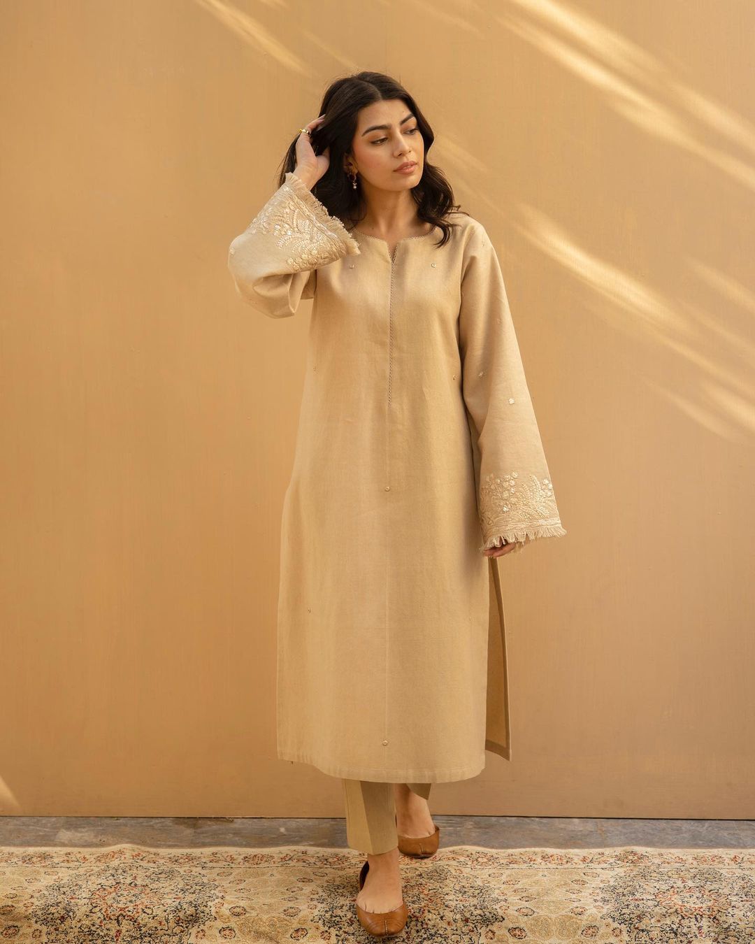 Desert Pearl, 2-piece stitched suit is a timeless masterpiece crafted from soft Dhanak fabric. This ensemble boasts a delicate beige hue and elegant floral embroidery on the sleeves. The subtle sequin embellishments provide a gentle shimmer, making this piece a truly beautiful addition to any wardrobe. A product that exudes effortless elegance, this two-piece suit features fringed cuffs and a straight-cut design that offers a timeless silhouette suitable for any event.
