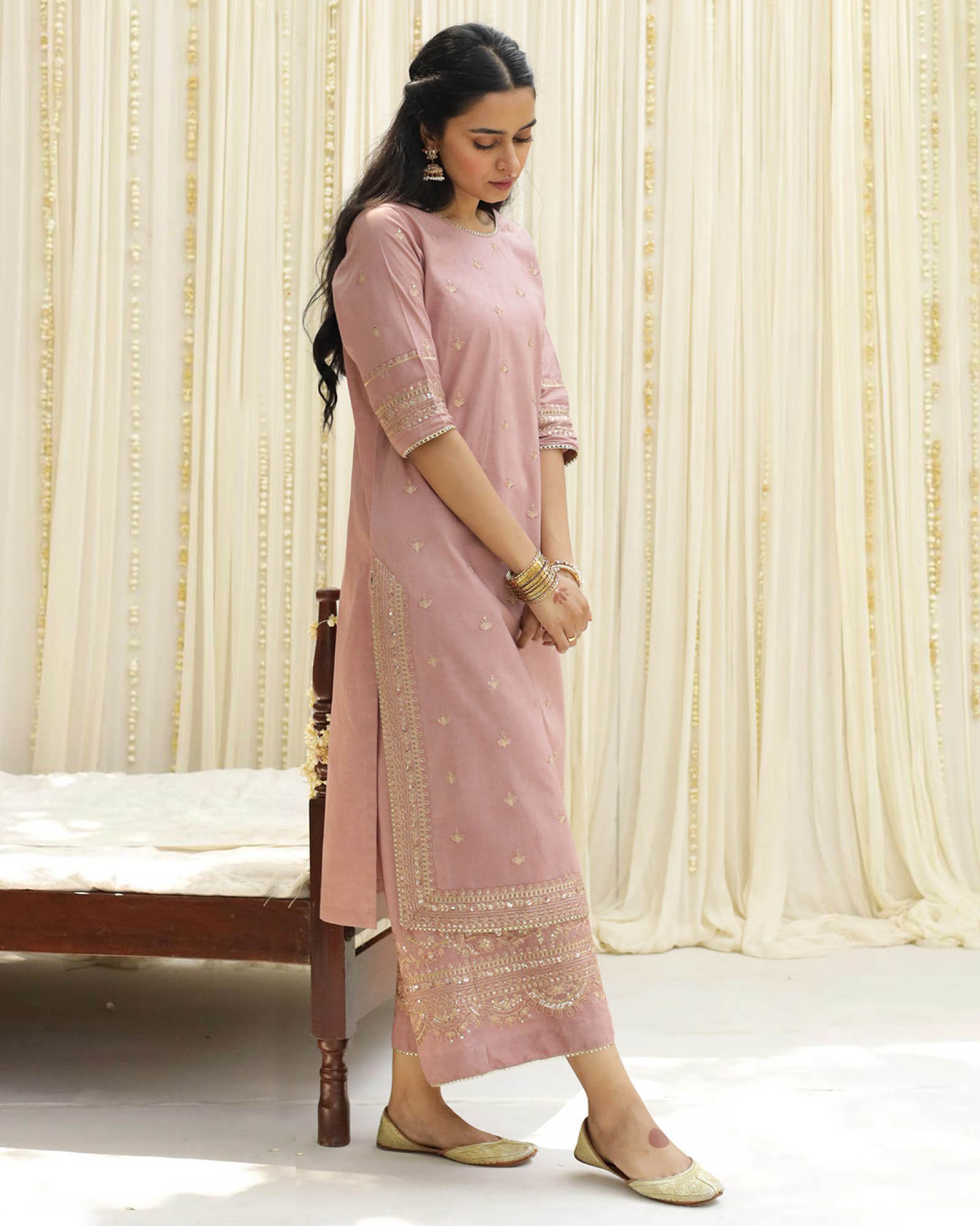 Pink Orchid is a refined 3-piece ensemble in a soft rosy hue, featuring intricate golden embroidery and subtle sequins. Made from luxurious Viscose Silk, it includes a tailored kameez with coordinated straight-cut trousers and a lightweight dupatta accented with golden touches.